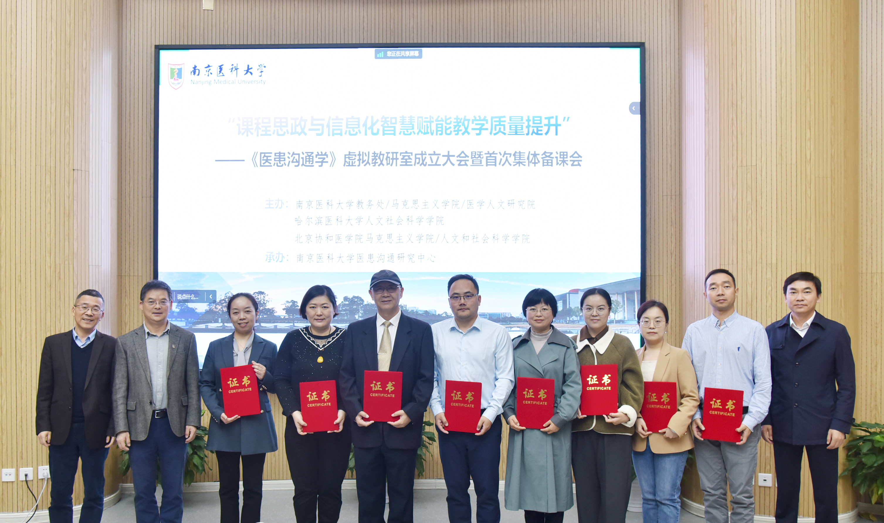11月11日,《医患沟通学》虚拟教研室成立大会暨首次集体备课会在我校江宁校区举行,由我校马克思主义学院、哈尔滨医科大学人文社会科学学院和北京协和医学院人文和社会科学学院三方院校共同主办,医患沟通研究中心承办。本次会议采用线上线下相结合的参与方式,17家兄弟院校及附院、35家本校及附院单位共计800余人参会。国内知名院校临床医学、医患沟通等方面专家展开相关主题汇报。