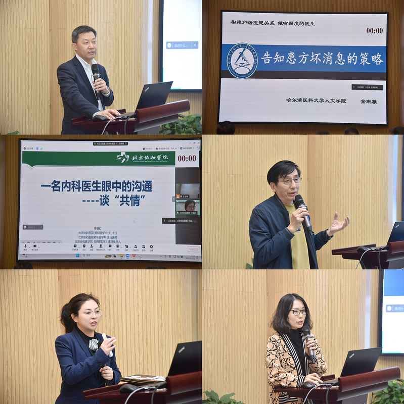 随后,医患沟通研究中心主任王锦帆教授作《医患沟通学教研建设与进展》报告,汇报了国内医患沟通学科的教学、科研建设与发展;北京协和医学院马克思主义学院人文和社会科学学院刘欢副院长作《大学生人际沟通技能教材与开发的探索》报告,对如何做好大学生人际沟通和医学生医患沟通的衔接、教材课程建设做了详细介绍;哈尔滨医科大学人文社会科学学院尹梅院长作《“十四五”规划教材医患沟通编写情况介绍》报告,将国家规划教材《医患沟通》建设进度作了详细汇报,上午会议由马克思主义学院孙厚纯书记主持。