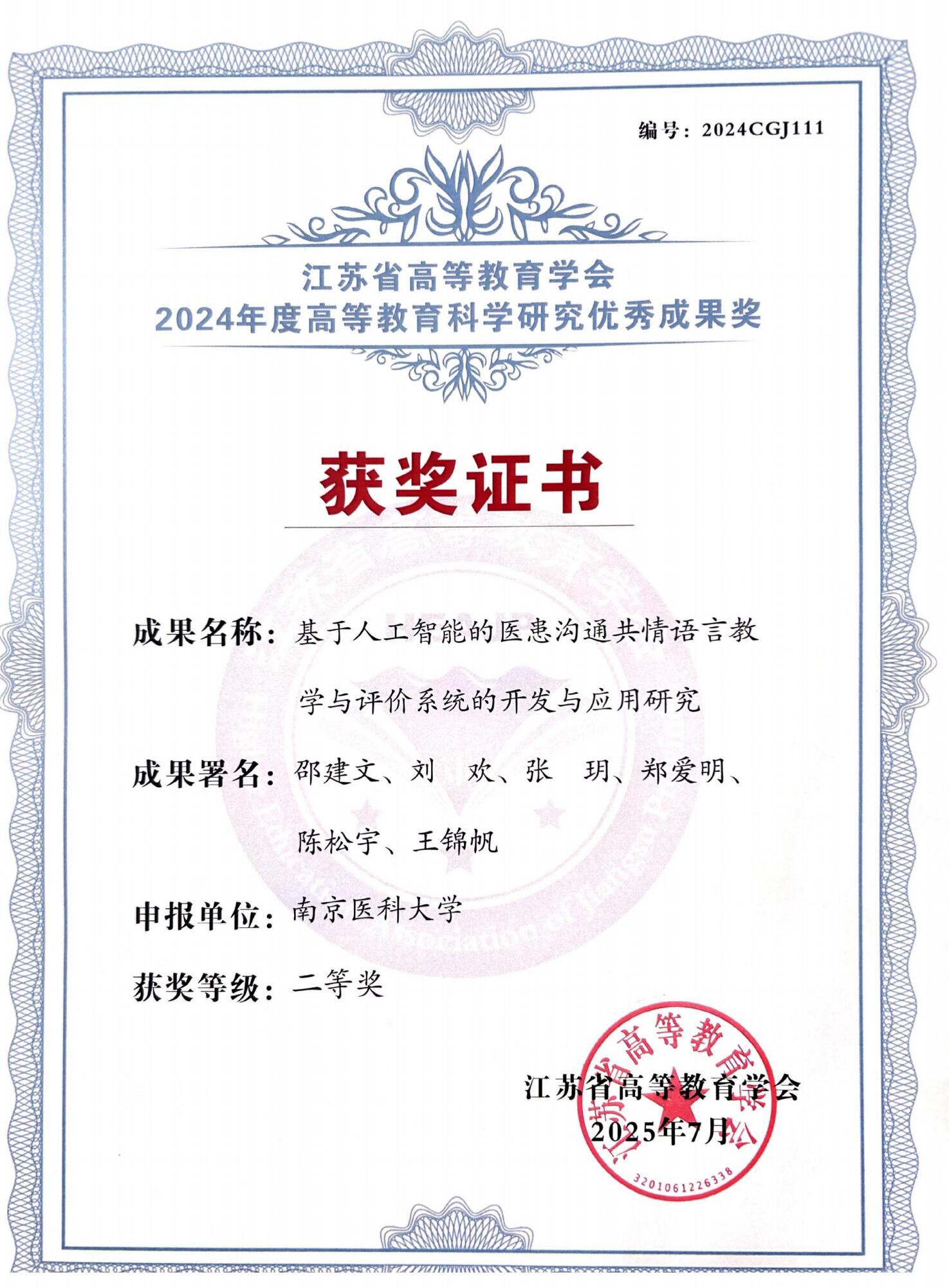 近日,江苏省高等教育学会发布了《关于公布2024年度高等教育科学研究优秀成果奖的通知》(苏高教会〔2025〕25号)。由马克思主义学院邵建文、张玥、郑爱明、王锦帆等老师撰写的论文《基于人工智能的医患沟通共情语言教学与评价系统的开发与应用研究》荣获二等奖。